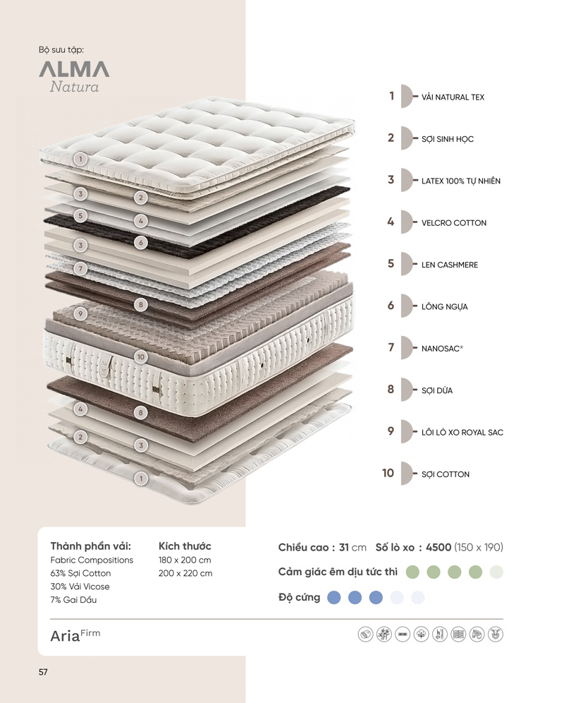 Nệm Aria Firm thuộc bộ sưu tập Alma Natura, lấy cảm hứng từ sự mềm mại của những đám mây. Kết hợp lớp lò xo nano Nanosac® và đệm lông ngựa tự nhiên, Aria Firm mang đến sự thoải mái đặc biệt và đàn hồi tự nhiên. Lõi lò xo túi RoyalSac® giúp cách ly chuyển động tuyệt vời, phù hợp cho các cặp đôi. Đây là sự kết hợp hoàn hảo của vật liệu tự nhiên cao cấp – thoáng khí, kháng khuẩn và tinh tế trong từng chi tiết thủ công.