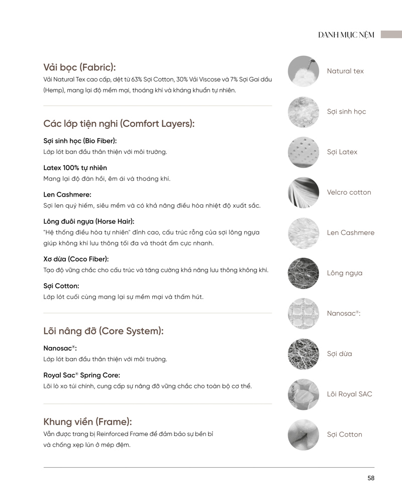 Nệm Aria Firm thuộc bộ sưu tập Alma Natura, lấy cảm hứng từ sự mềm mại của những đám mây. Kết hợp lớp lò xo nano Nanosac® và đệm lông ngựa tự nhiên, Aria Firm mang đến sự thoải mái đặc biệt và đàn hồi tự nhiên. Lõi lò xo túi RoyalSac® giúp cách ly chuyển động tuyệt vời, phù hợp cho các cặp đôi. Đây là sự kết hợp hoàn hảo của vật liệu tự nhiên cao cấp – thoáng khí, kháng khuẩn và tinh tế trong từng chi tiết thủ công.