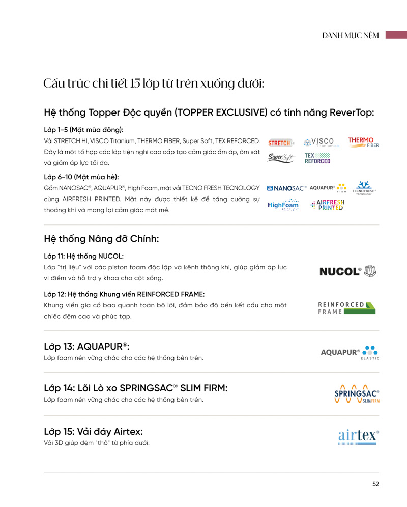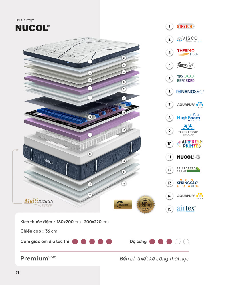 Premium Soft là biểu tượng của Bộ sưu tập Nucol®, được thiết kế với sự mềm mại, sáng tạo và ấm cúng. Lớp Nanosac® mang lại hiệu ứng “mây” độc đáo, kết hợp lõi Springsac® được cấp bằng sáng chế cho khả năng nâng đỡ tối ưu. Các vật liệu tiên tiến như Thermo Fiber, Aquapur® và TecnoFresh® giúp điều hòa nhiệt và thông khí vượt trội. Hệ thống Nucol® hỗ trợ theo vùng, đảm bảo giấc ngủ êm sâu, mát lạnh và thoải mái trọn vẹn – đỉnh cao của nghệ thuật nghỉ ngơi Gomarco.